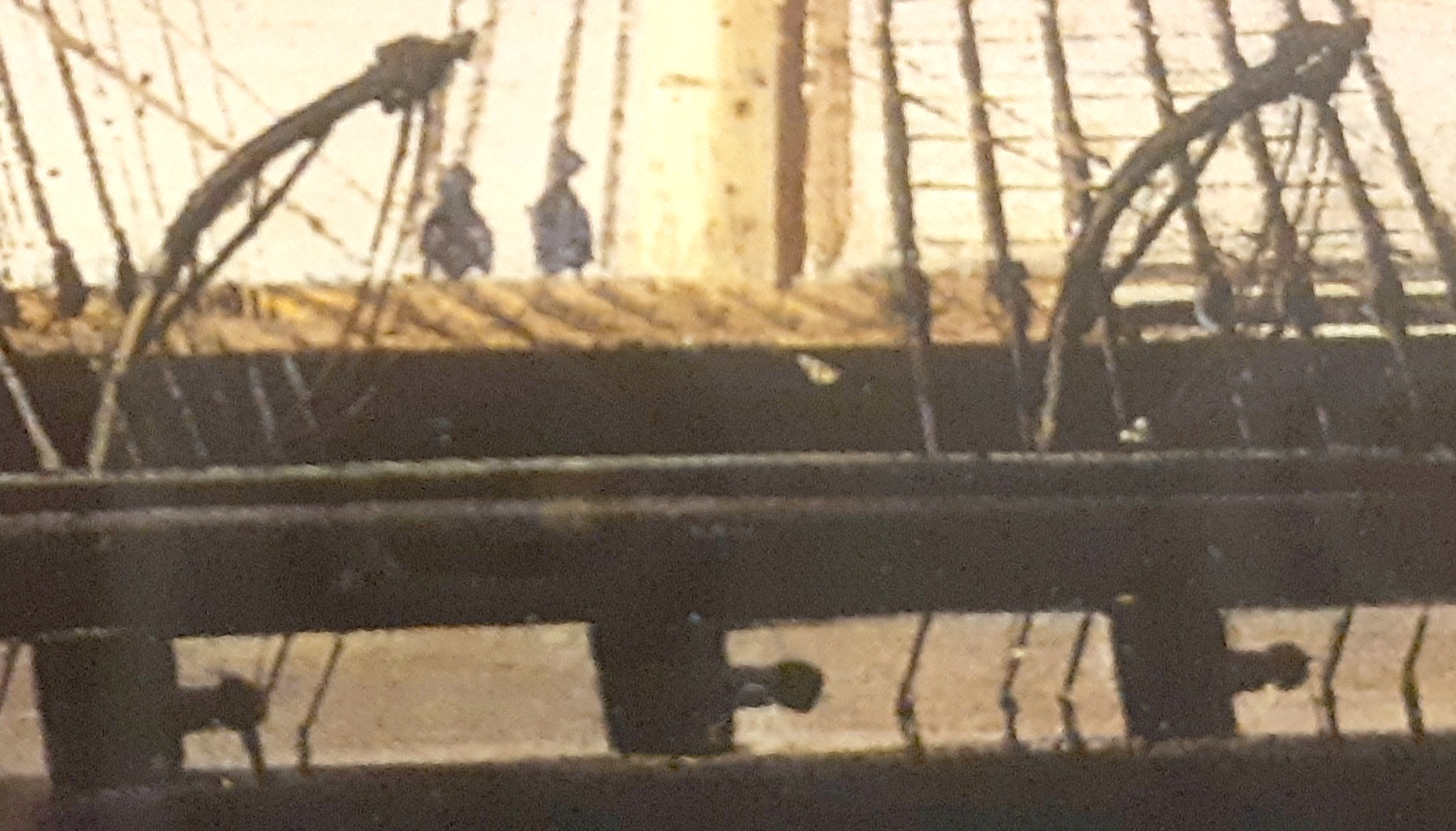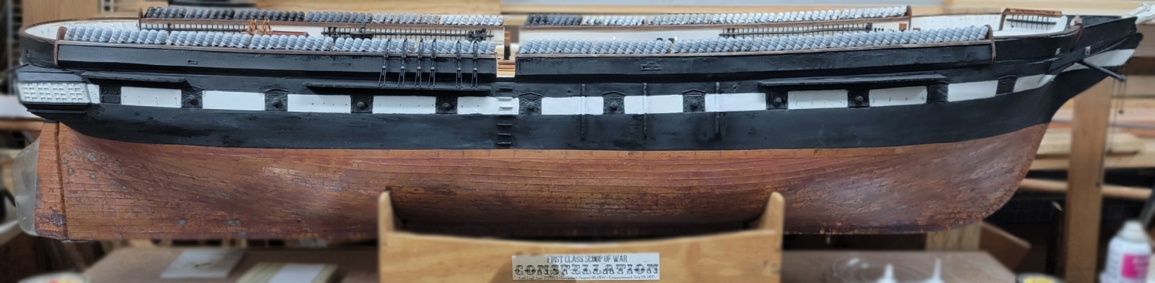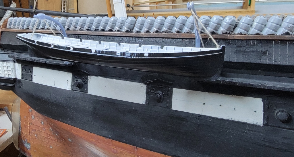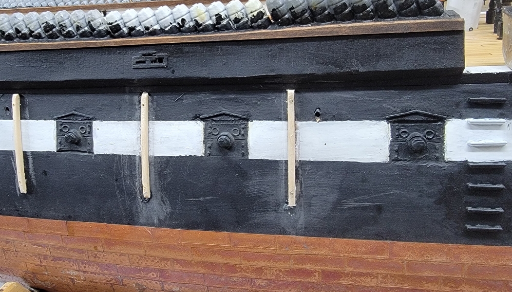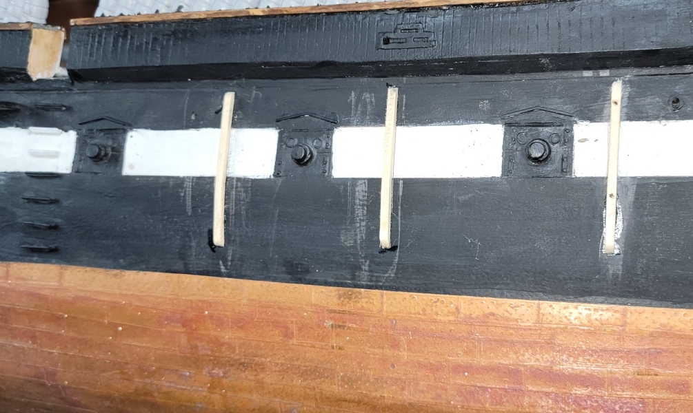 In the 1856 portrait of the ship, there are three definate rub-rails on her side that align with the main hatch. I though there might be some between the davits, by I can't see any. In later paintings, and then photos, the three for-certain are always there, and some were added for the new arraingment of quarter-boats. I decided to install just the three amidships (ignore the '?' I don't know what that's a shadow of).