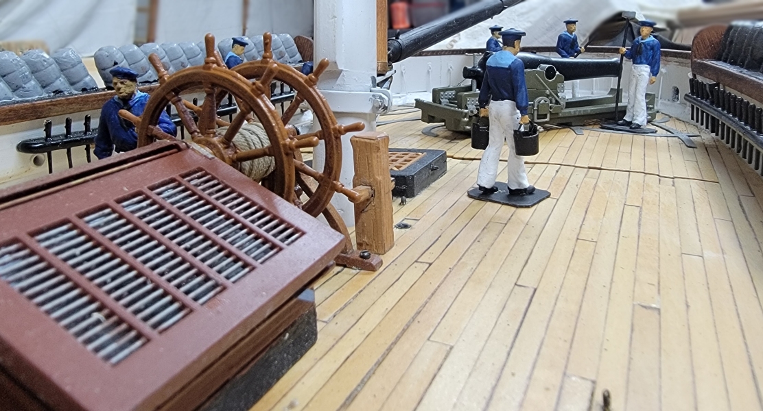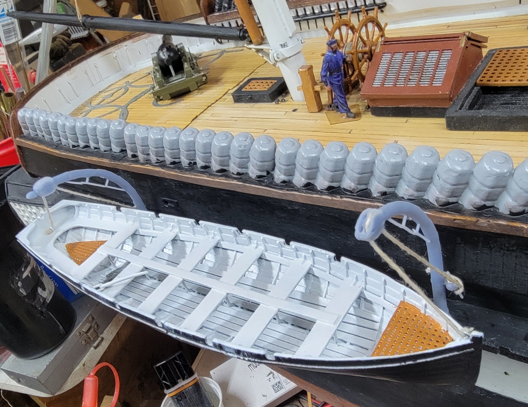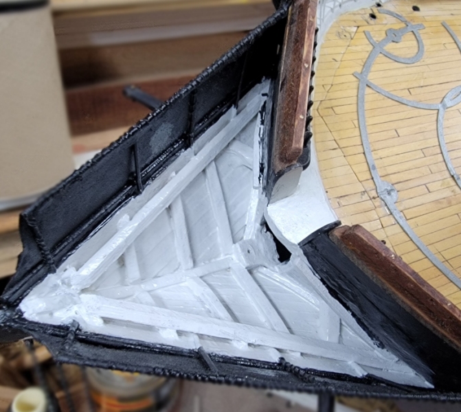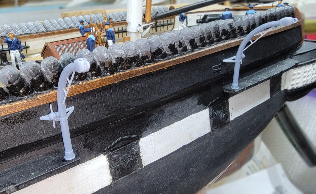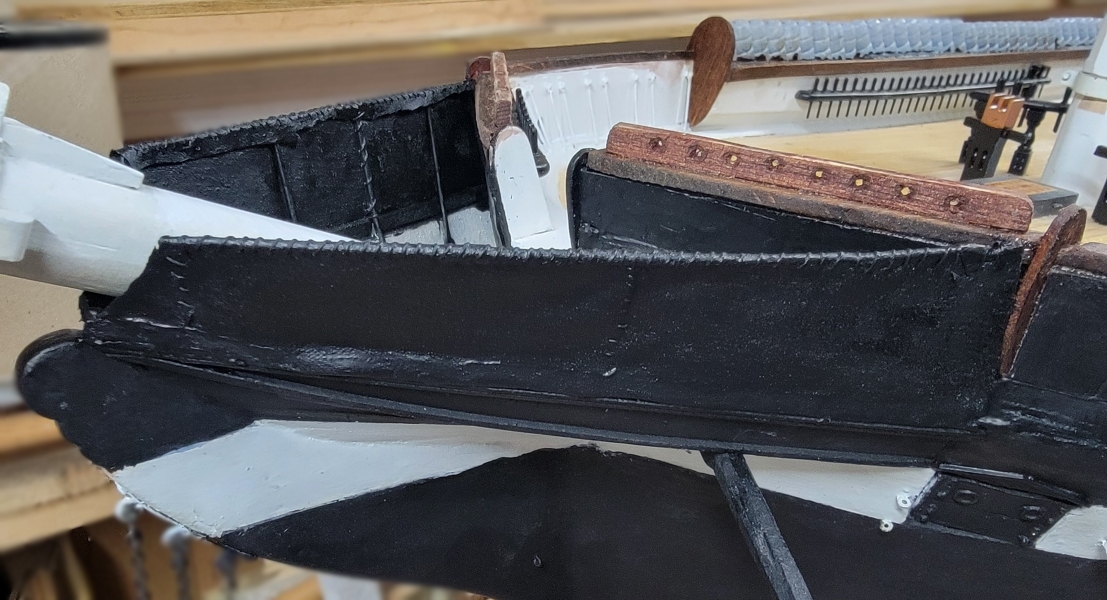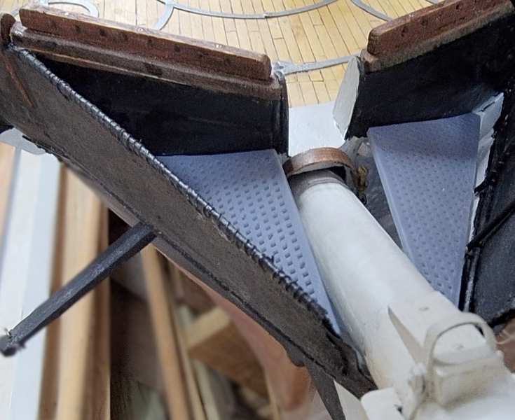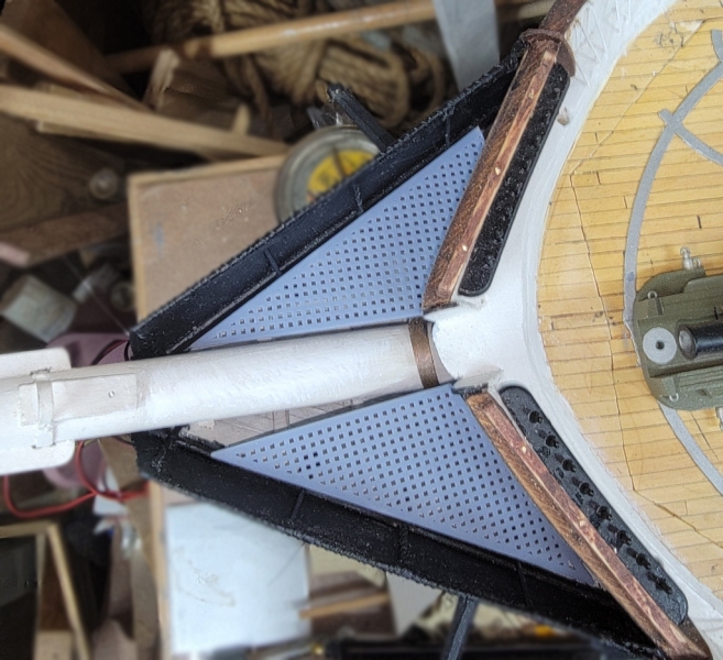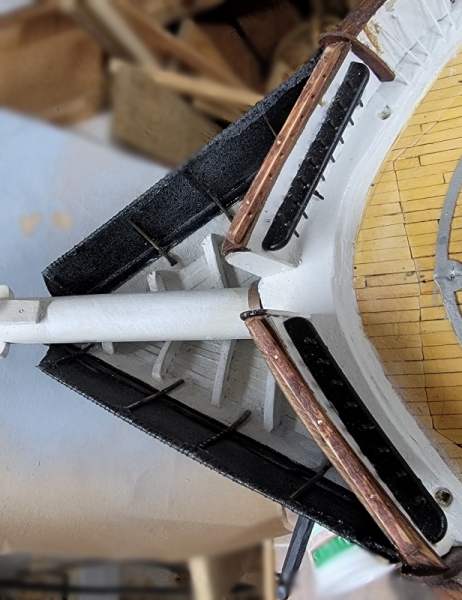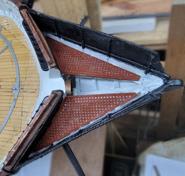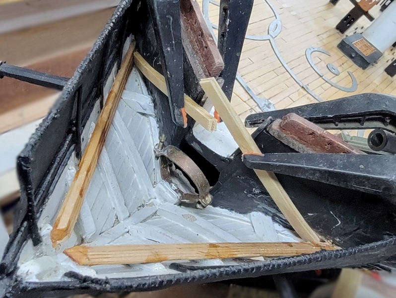 I installed the cleats, clamps, ledgers, whatever, and the printed gratings did not fit well, so I made new templates, and remodeled the gratings. While they printed I painted in the head and rebuilt the gammoning iron (not in picture).