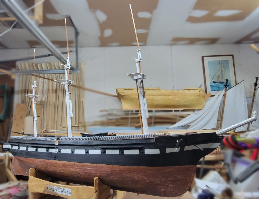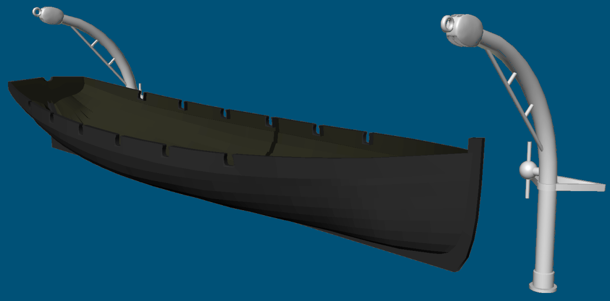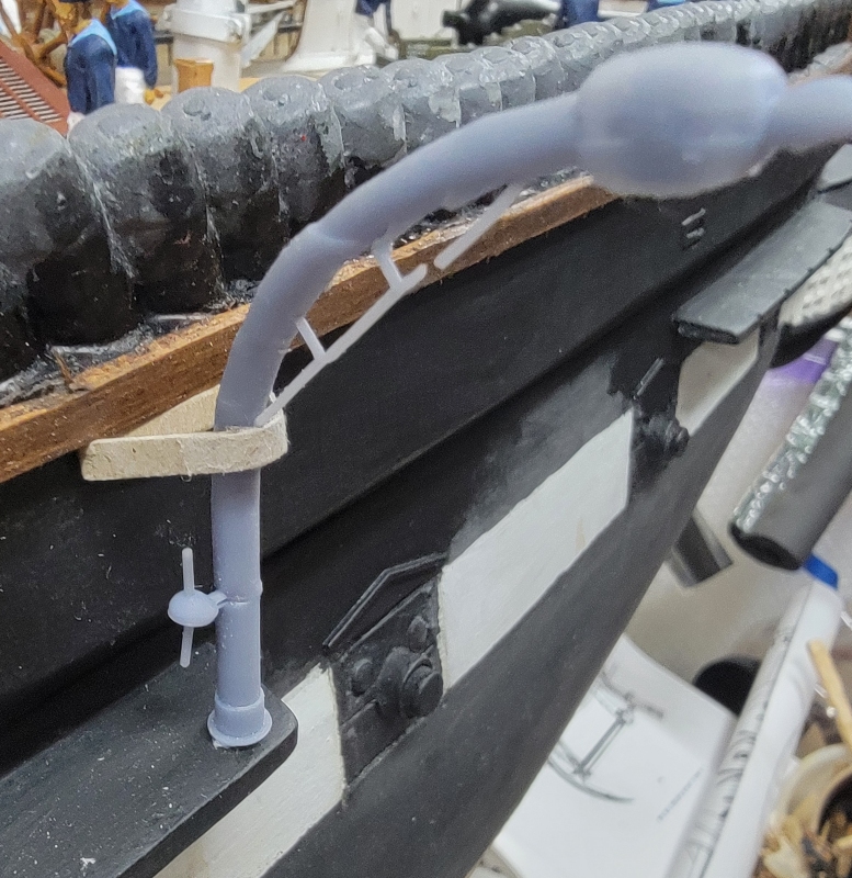 Friday, June 18th, 2025: Still trying to figure out the davits. In the 1856 painting of the ship by Tamoso de Simone, the quarter-boat davits are depicted without the boat in them. Still, it's not much more than a silhouette. They appear fully arched, or nearly so. There' no indication that they extend below the channel to bace against the hull, so I assume there must be some sort of brace to the bulwark that not depicted in the image. So I went purly with the silhouette, and printed it. It didn't print well. I print four and two failed completely. What I got was enough to see how it looked.
