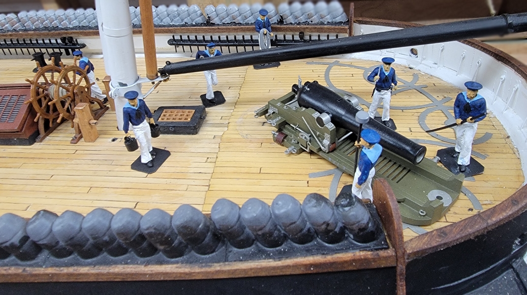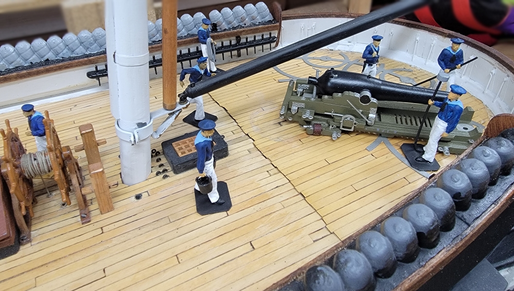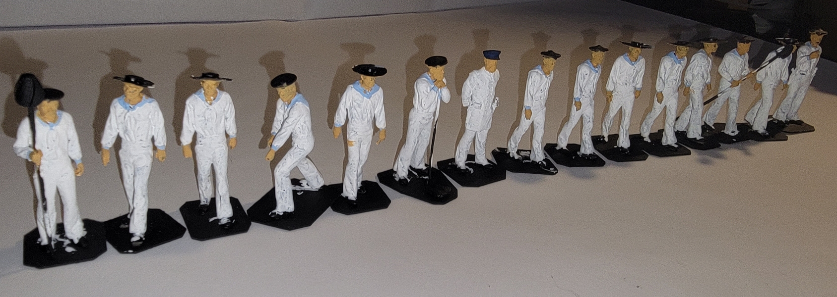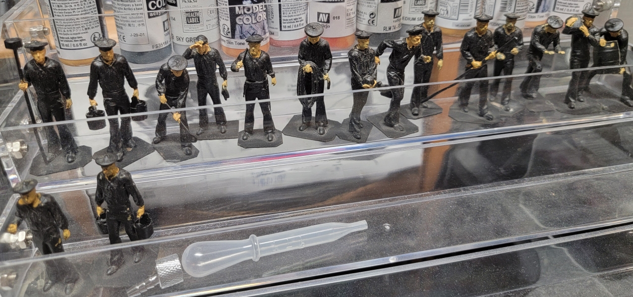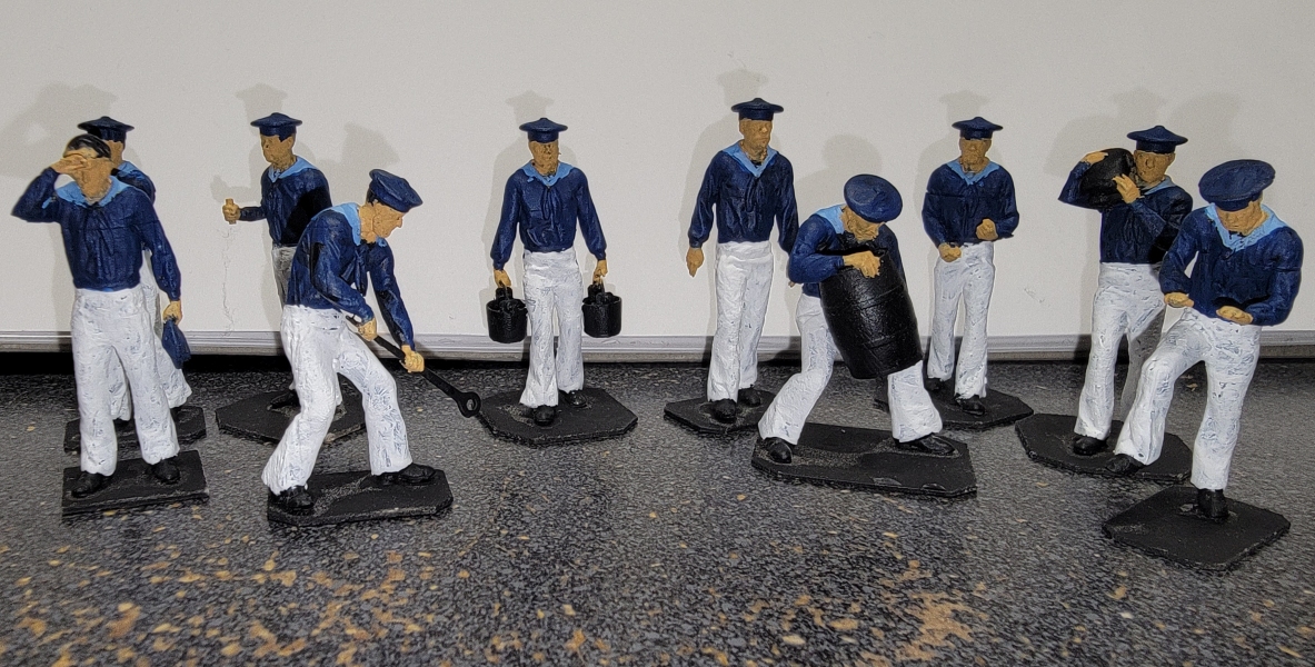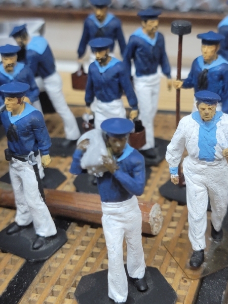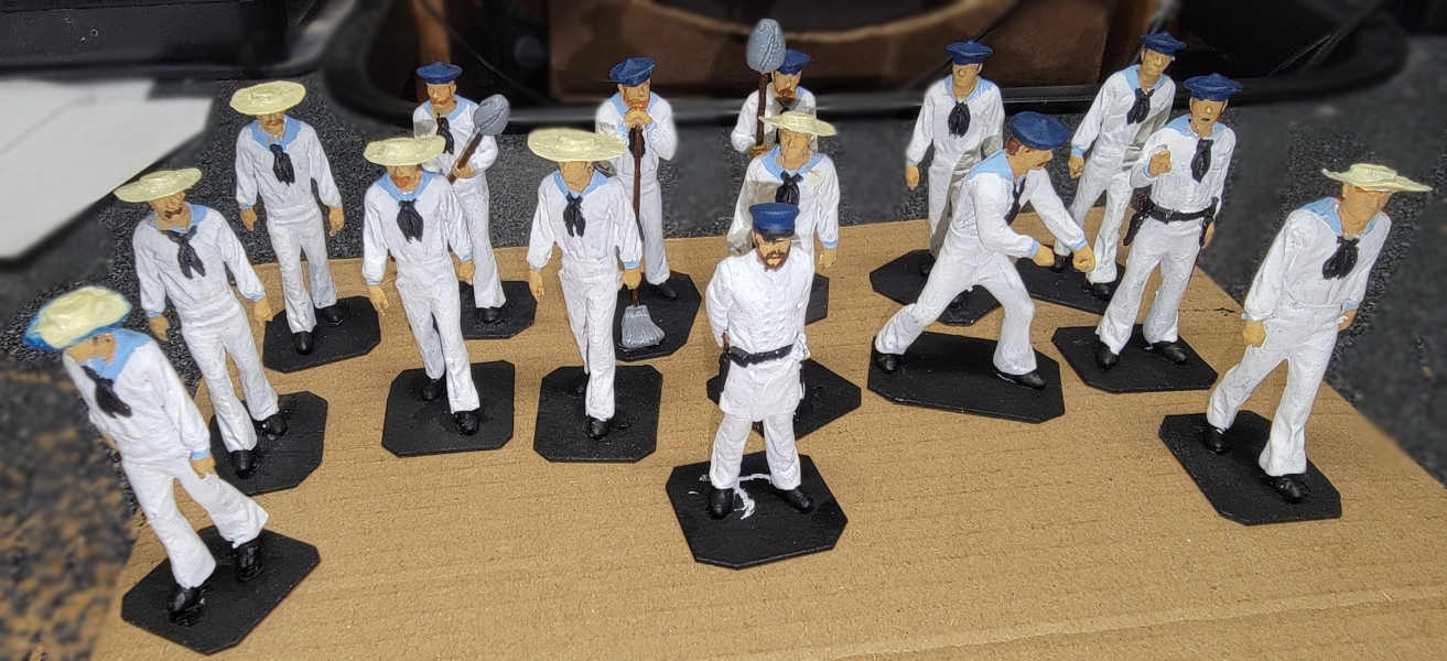 21st-22nd: For a change-of-pace, I decided to paint the 3D printed crew figure I had. I didn't have any white, black, or blue, so I didn't get far. I did have half-a-dozen or so skin-tones, so I just painted hands and faces. That alone made a big difference in them, but today the paint I ordered arrived and they got white pants, blue jackets, and light blue flaps. I still to order more paint for various hair colors, and things like buckets and casks. Even Ivan got a new look, and I think I'll leave him clean-shaven this time, since so many of the other fellows have facial hair.