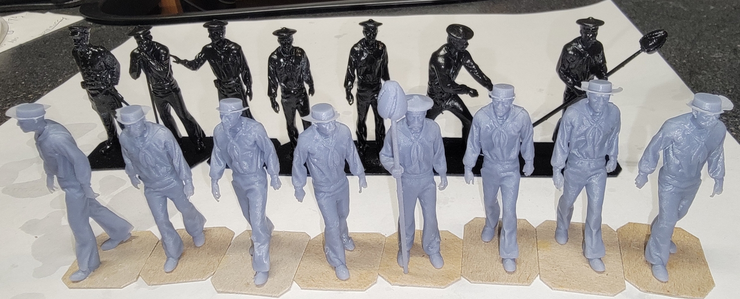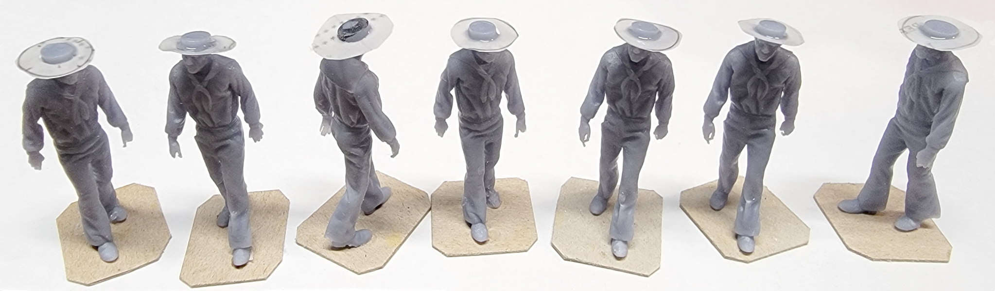~28th: I modified the files of three figures; two "walking" figures got straw-hats, and I swapped head and implements on the Rammer fellow, to make a sponger holding his sponge upright, instead of at port-arms. Meanwhile, I printed a batch of "stock figures," but of 11, only 7 came out. I started a batch of the figures I modded, which printed fine, except the hat brims were too thing and didn't turn out. I cut donuts from plain paper and brushed resin from the printer on them, then zapped them with UV making new hat-brims.