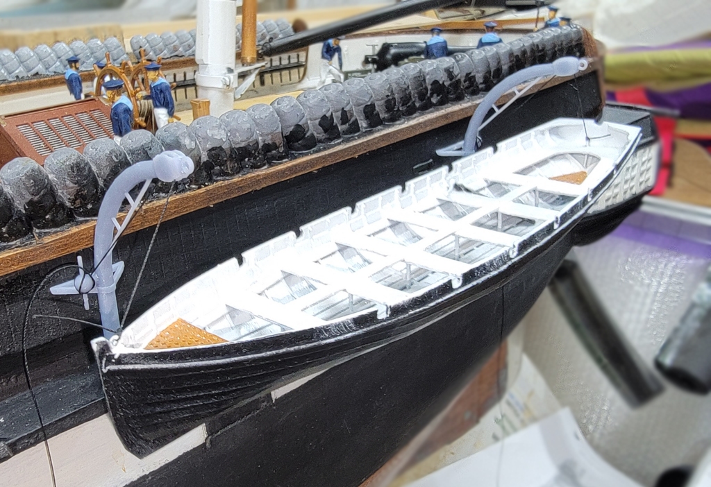Using the poor print of a davit from earlier, and some chipboard, I worked out a brace for the davits that seemed likely. I made a new "block" portion, with a ring at the tip for the line or chain that linked the davits. We'll see how, and if, it turns out in 4 hours.