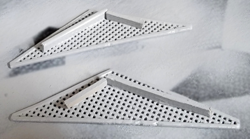 These gratings did fit, but kept trying to curl, so I glued a wood beam along the long end to prevent that, and primed them.