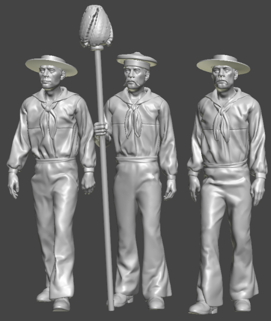 23rd: The rest of the figures I have were painted as far along as I have colors for. More paint should arrive tomorrow and everyone will get haircuts and beards trimmed. 24th: Everyone now has hair, and buckets, cask, pistol grip, handles, etc. There's some touch-up to do, which will cause more touch-up, and so on. I also made a black crewman, there'll be some more, but I have to print more figures.