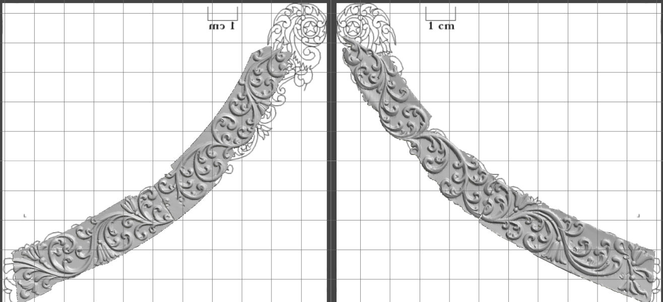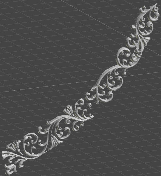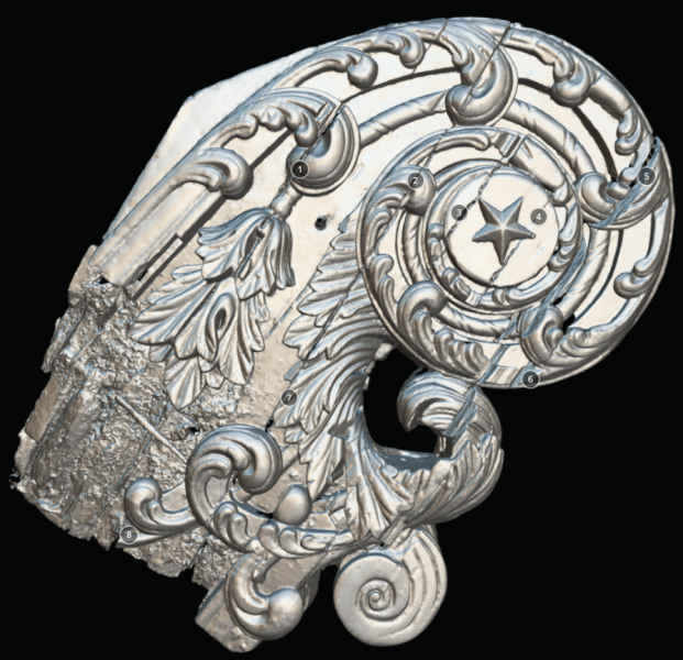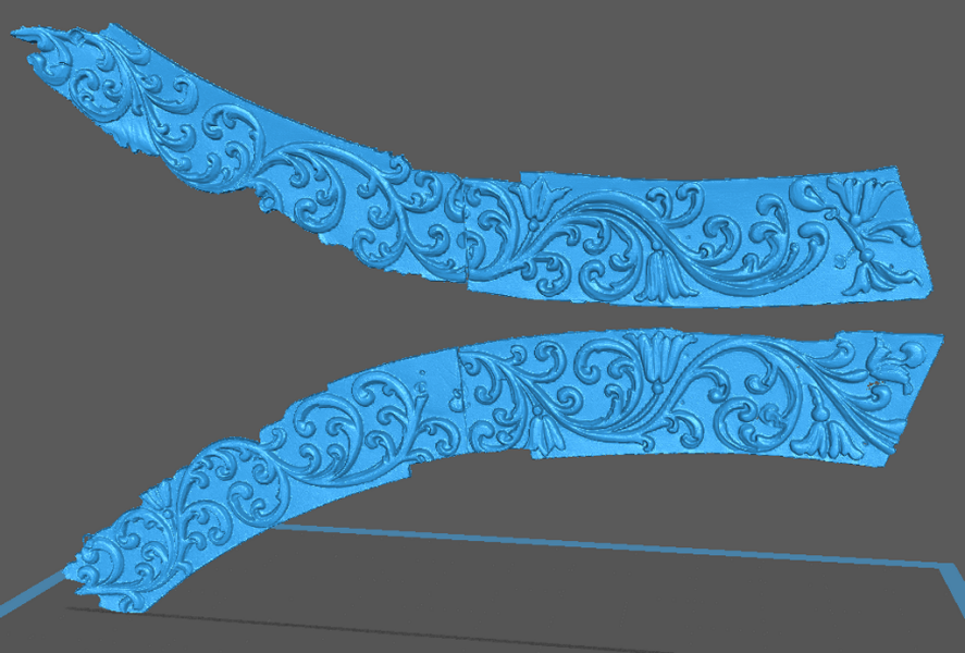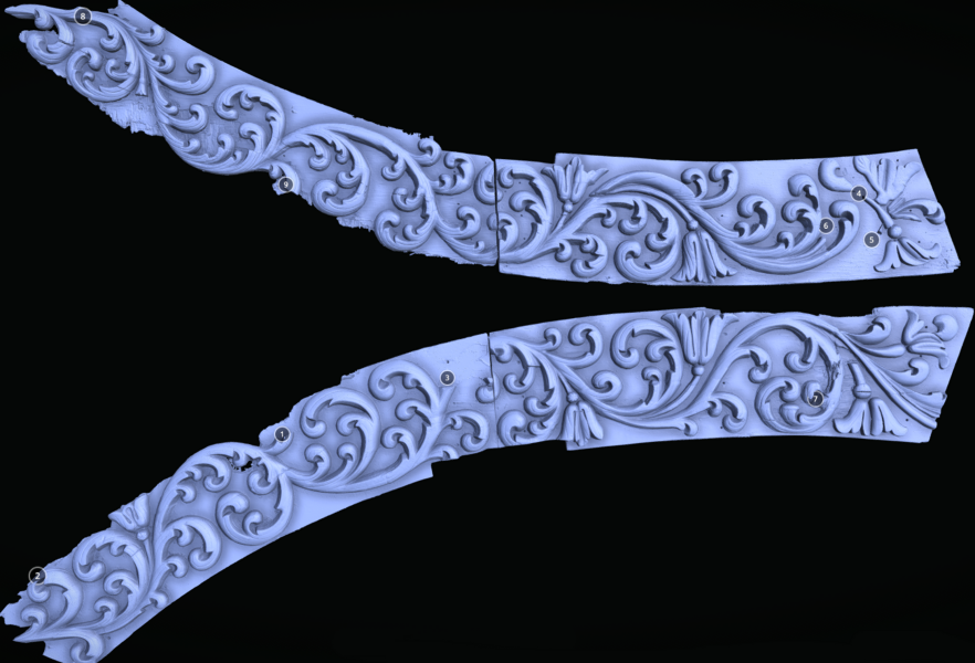I've started getting the 3D model down to just the carvings, and removing the scanned in backer-board. The sides aren't mirror images of each other, each is a little different than the other side. I don't know if they were always that way, or repair work over the years made them different.