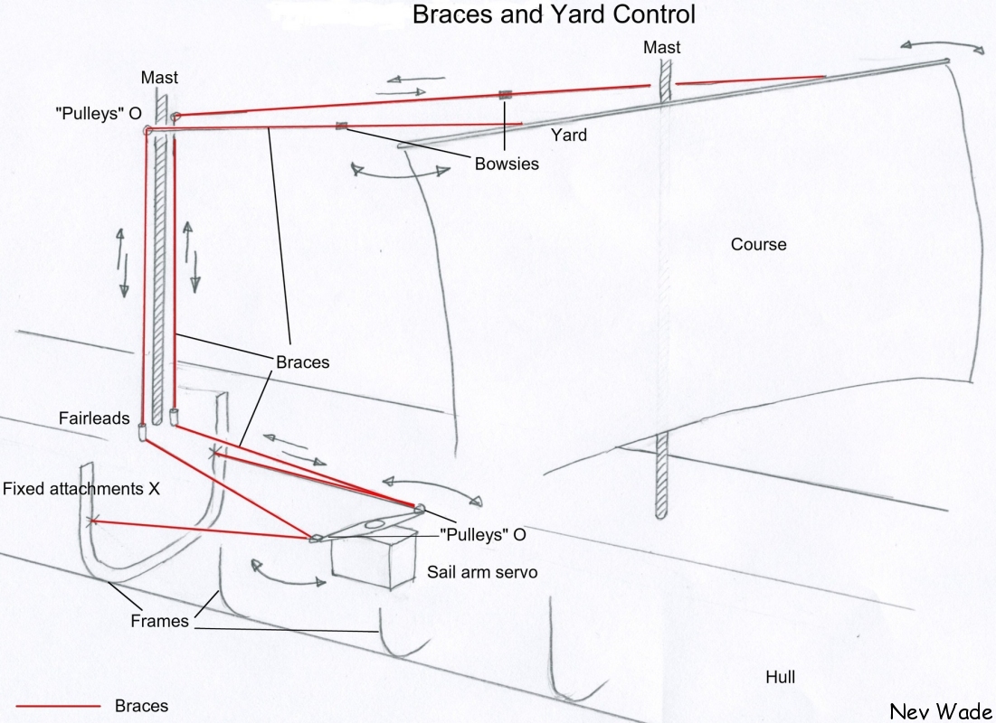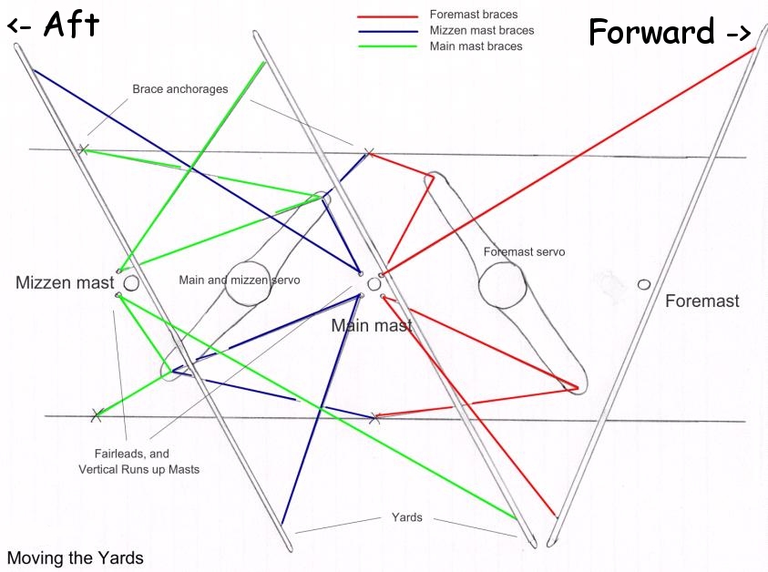 Generally speaking the square sails are hung from spars across the masts called yards. The yards pivot on the mast in the horizontal plane to angle the attached sails depending on where the wind is blowing from in relation to the direction of the vessel. The sails are angled to catch the wind and use it to move the ship forward. The more from the bow (front) the wind is blowing from, the more angled to one side the yards/sails have to be to catch it, but there's a limit; the yards can only turn so far, and once the wind is ahead of that, it'll blow on the wrong side of the sails and actually hinder the vessel's forward movement. The yards are rotated about the mast by the crew pulling on ropes called braces. Get used to the term braces, because they're mostly what this site is about. The braces are typically hauled-in, on one side and paid-out on the other by the crew to move the yards as someone directs them. Our crew is made up of servos, winches, and other mechanisms, to accomplish the same function.