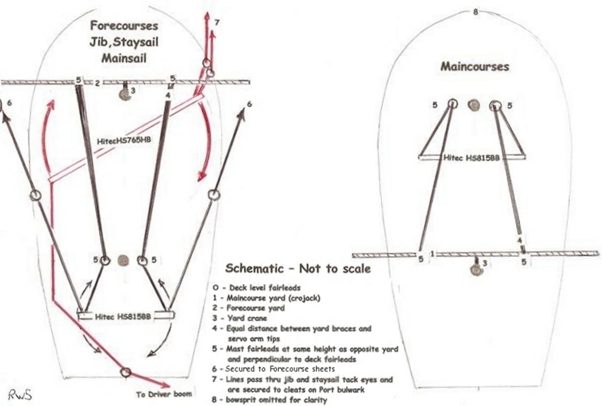 This page is a work-in-progress. It is intended to become a library of systems for controlling the yards and sails on radio-controlled model square-riggers.