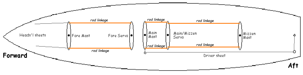 Many model use a pair of rods to link the servo to the horn on the head of the rudder. Both horns are the same width, so the rods move in parallel in a puch-pull operation to steer the boat. what follows is basically the same geometry. The first set-up doesn't use rod, but length of line (braces) to move the yards.
