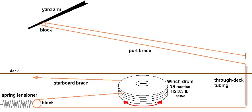 Probably the simplest set-up is replacing the servo arm in the Parallel Bracing set-up, with a winch. The winch drum will be in two parts, with port braces wrapped around one section and starboard braces wrapped the opposite way on the other section, so when the winch turns it pulls the brace in while paying-out the othe brace. The issue with this will be as the winch turns, the paying-out side will slacken. Slack in the braces can cause snags, lines to run off their winch-drums, tangling, and jamming the system.