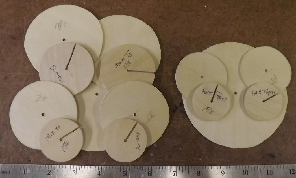 and the flanges a bit larger, I make them 50% larger in diameter than the drum. You need two drums for each brace, one for port, the other for starboard; one draws in as the other pays out. From the thin stock, cut flanges for between each drum;