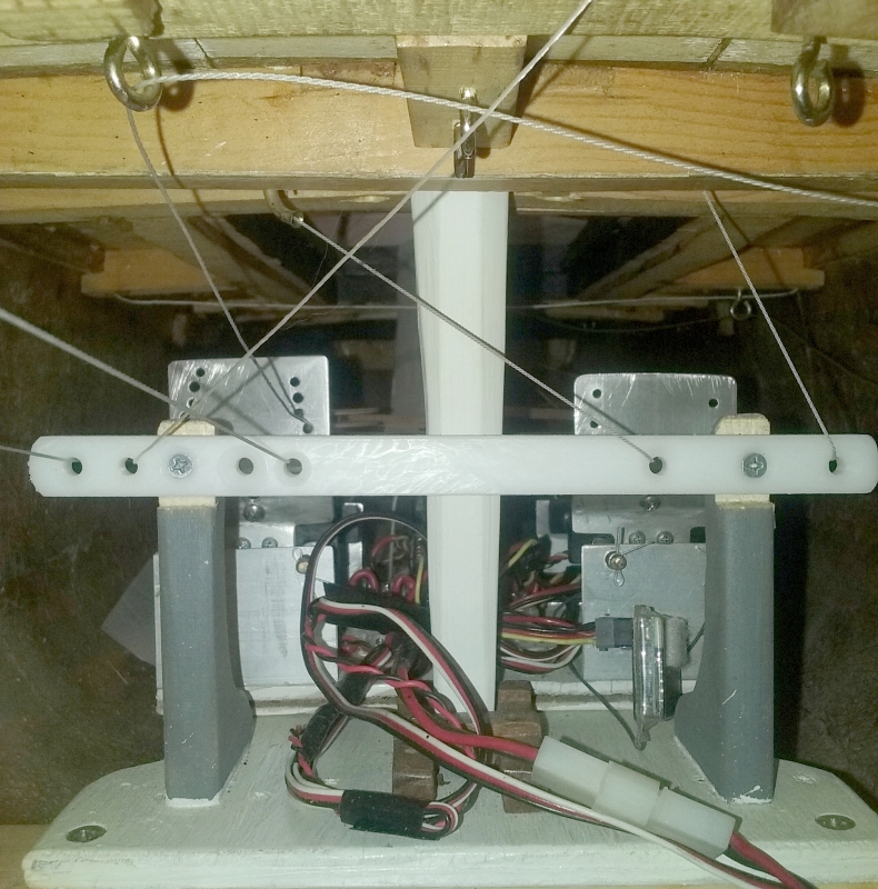 Previously, tension on the braces was maintained by springs, elastic, or weights, on the braces. Another way, that I use on my 1:36 scale Constellation; is to move the winch itself to compensate. That's the premis behind the sliding brace winch: