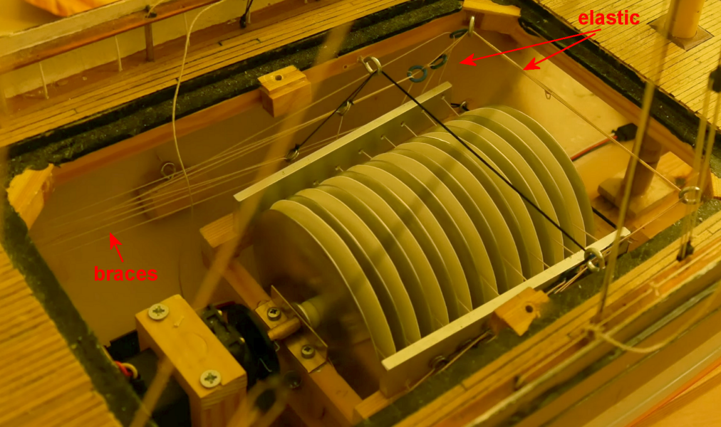 Georg Reinbold uses a more modular, version of this system in his bark Nernberg (1:75 scale, I think). Using sized drums, to get the right pull length for each yard, as detailed previously in the drum-making section;
