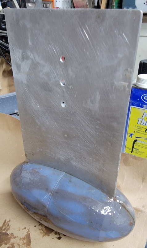 1/20/2024: Still to cold to epoxy the bulb together, and too messy to do in the house, but a couple of folks ask about what going to hold the bulb to the fin. The bulb's halves will get epoxied to eachother and the fin. To prevent the bulb from just dropping off if the epoxy doesn't stick to the aluminum for whatever reason, there's a hole near the bottom of the fin, and corresponding holes drilled partway into the lead/epoxy in the bulb. A metal pin will be captured here so the bulb can't drop off unless the halves come apart somehow.