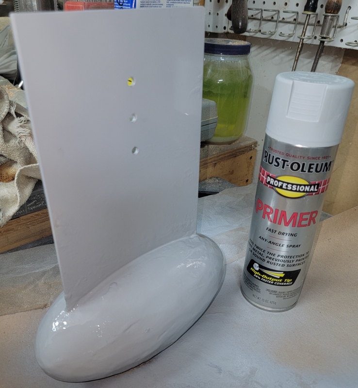 I wrapped a bit of panty-hose around the bulb to act like glass cloth and strengthen the bulb against impacts. The picture isn't pretty, but it's shows progress. There's a lot of sanding to do, which I'll do outside with a disk once it quits raining. It'll get more epoxy on it, without sawdust this time, to make everything smooth. A paintjob to match the model's bottom, and it'll be done.