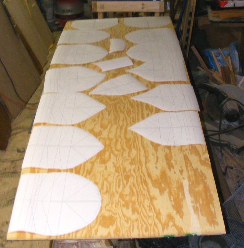 The paper patterns are cut out, laid out on the wood and their general outline traced. They're rough cut with a jigsaw. The paper pattern is glued on using glue-stick,