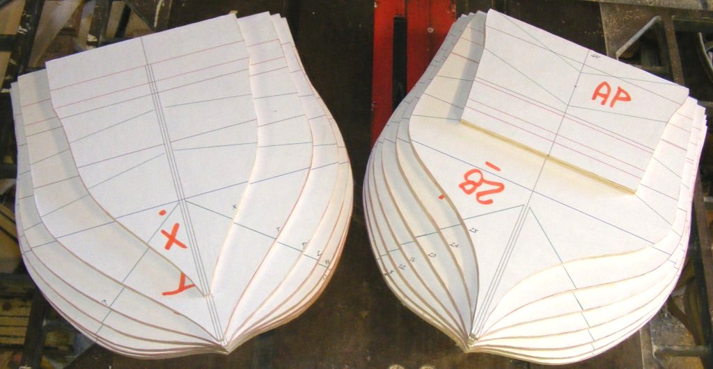 These paper patterns will be used to cut the plywood forms to shape and help note such things as the wale, decks, waterline, etc.